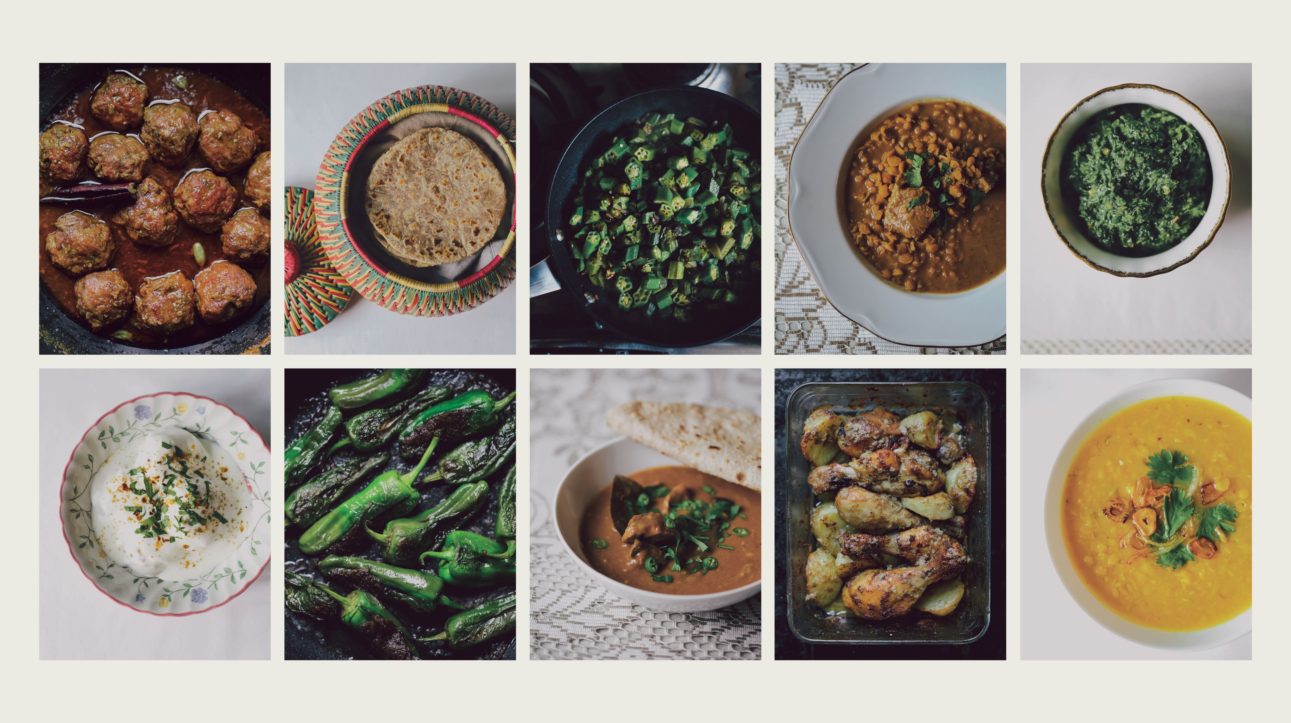 Styling Indian food is notoriously difficult. But a true testament to how fresh and authentic Mama Khan's food is — is that everything we cooked hardly needed any styling at all! We wanted the photos of the food to feel like you were in our family home, as though you were right there eating with us. We used crockery we've had for more than 30 years. Tablecloths we sewed together as children. Pots and pans we use on a daily basis. Our mother's cooker. Work surfaces around our kitchen. Everything you see has been shot in our kitchen and in its natural light. There's no studio equipment and we didn't need to buy a single prop! We had everything we needed right there.